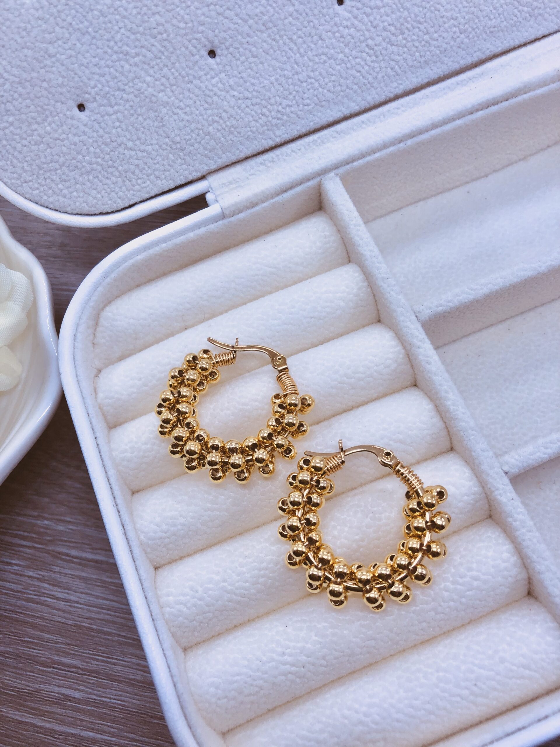 Estas candongas de aro amplio destacan por su brillo sutil y su forma limpia, convirtiéndose en el complemento ideal para elevar cualquier look con un toque de elegancia moderna.